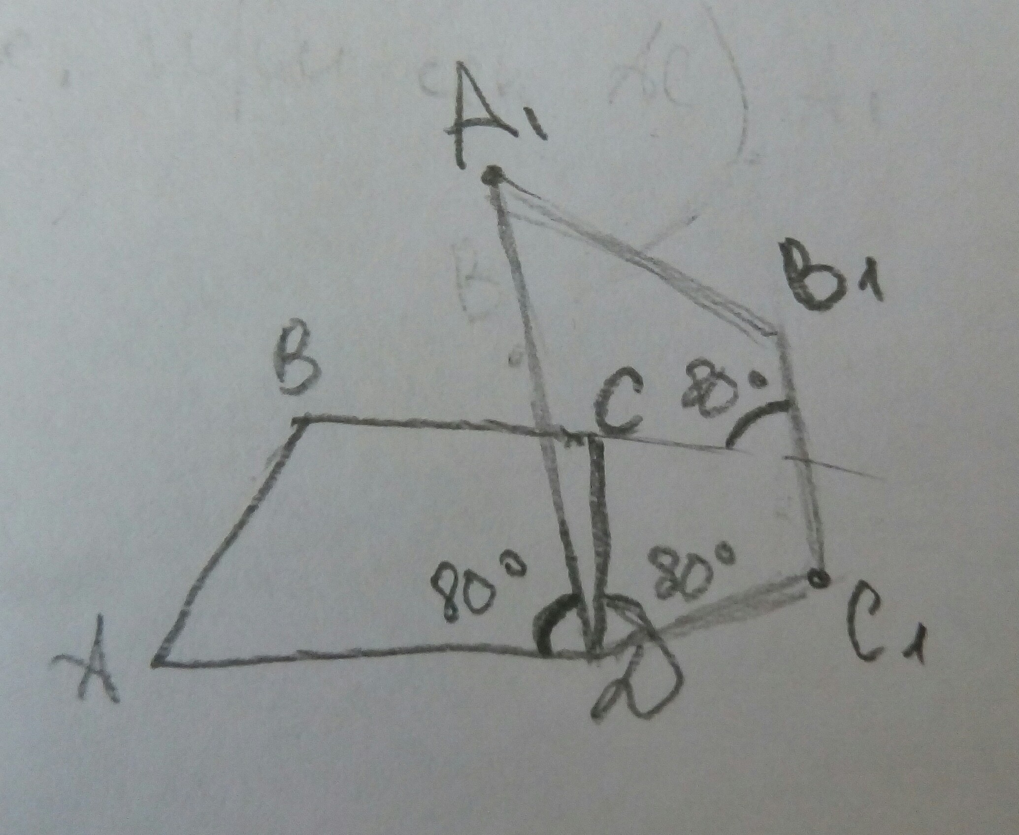 Помогите построить фигуру, полученную с помощью поворота по часовой стрелке на 80° вокруг вершины трапеции Д.