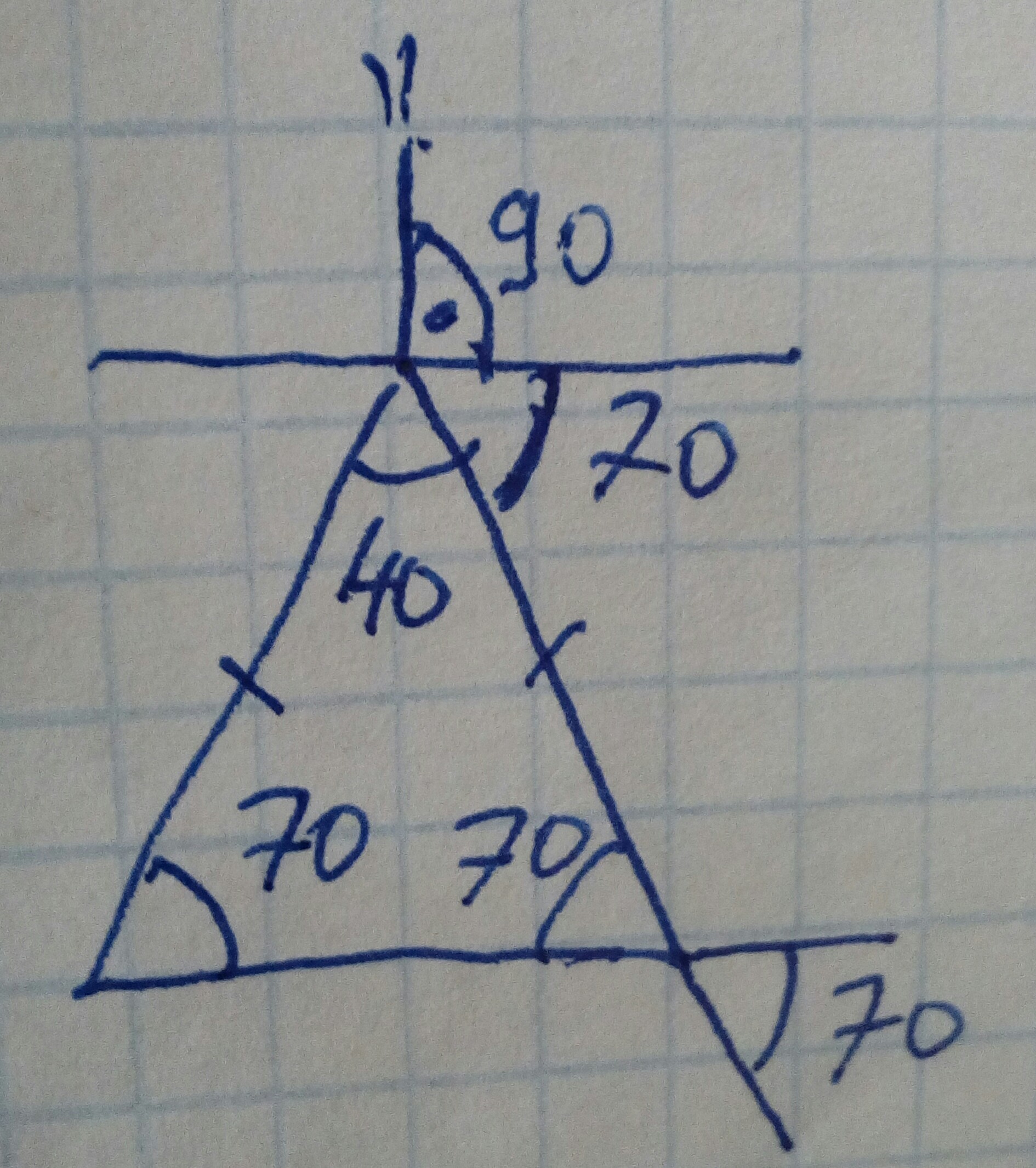 Сумма углов в треугольнике 180°, значит, угол при вершине 180-(70+70)=40°.
