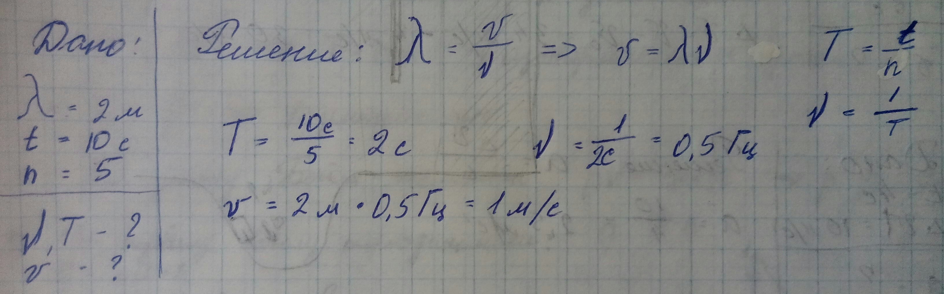 По морю движутся волны,расстояние между соседними гребнями которых равно 2м.На волнах колеблется мяч. За 10 с мяч совершил пять колебаний. 1)Чему равны частота волны и её период? 2)Чему равна скорость волны?