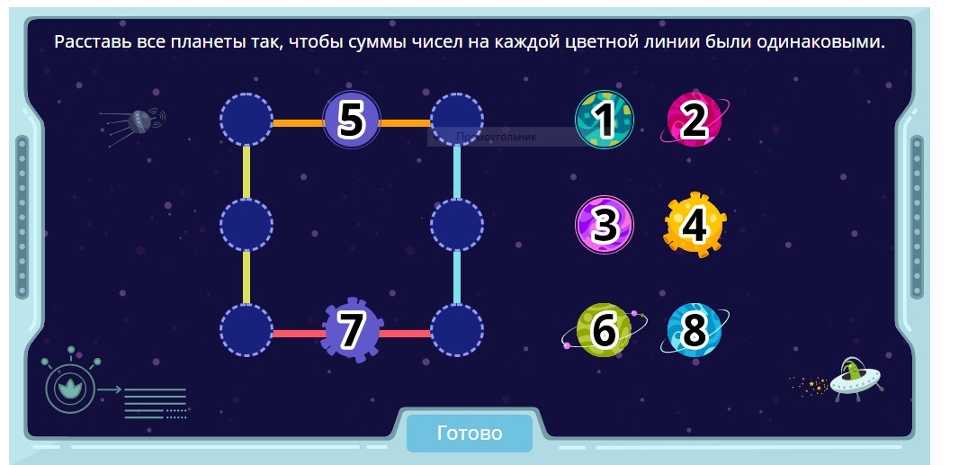 Расставь все планеты так,чтобы сумма чисел на каждой цветной линии были одинаковыми