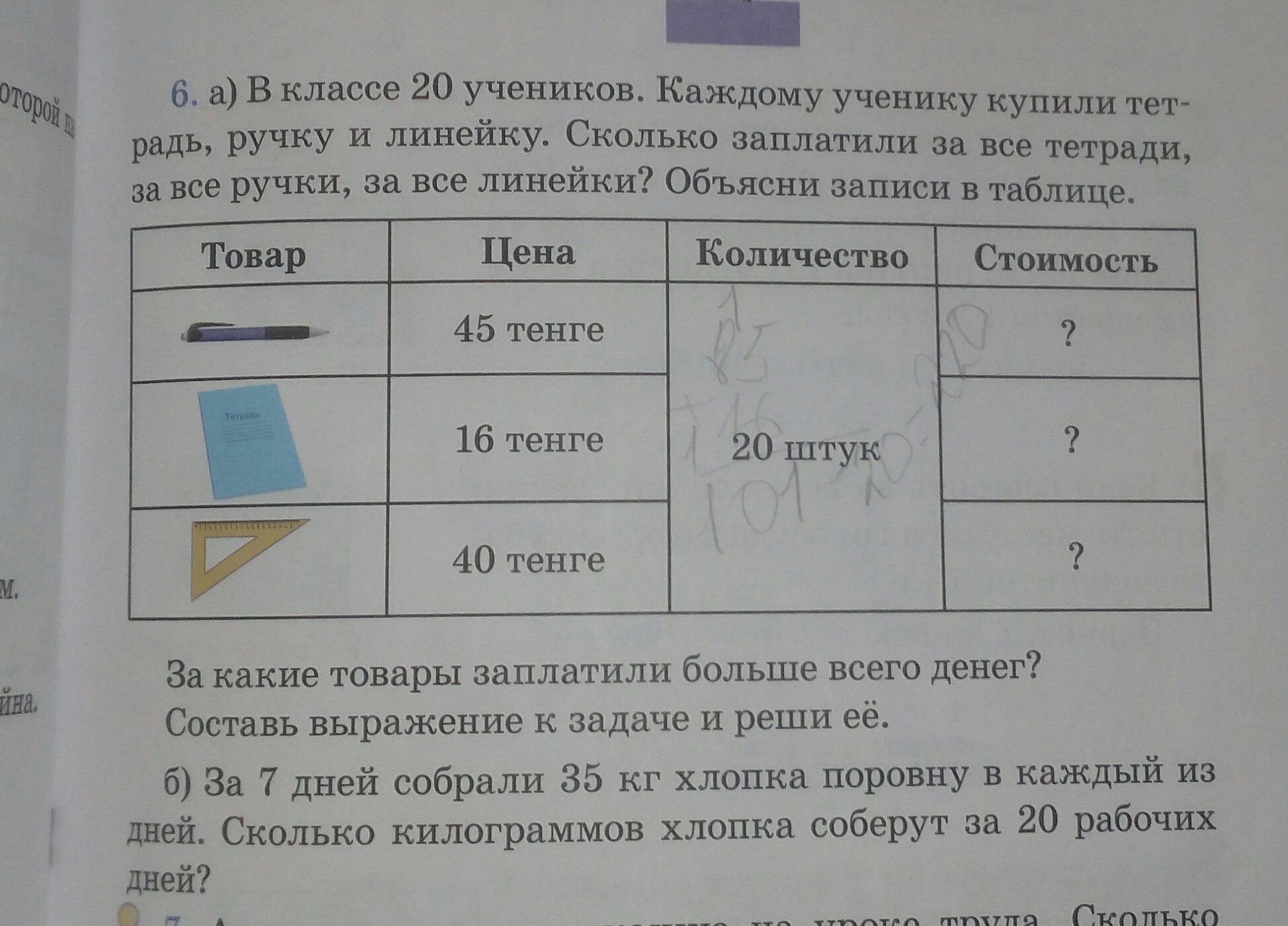 5 кг хлопка в день. Следовательно, за 20 дней 100 кг хлопка.
