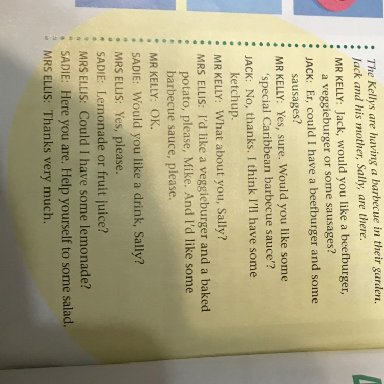 Прочитайте Диолог и ответьте на вопросы How many food and drink words can you hear?c)Are these sentences true or false ?не правильно 1)Jake isn’t very hungry.2)Jack doesn’twan’any sausages.4)The Kellys haven’t got any fruit juice 5)Sally would like some lemonade.6)There isn’t any salad.
