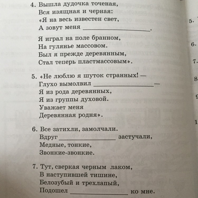 1.Кларнет 2. Фогот. 3. Тарелки 4.рояль