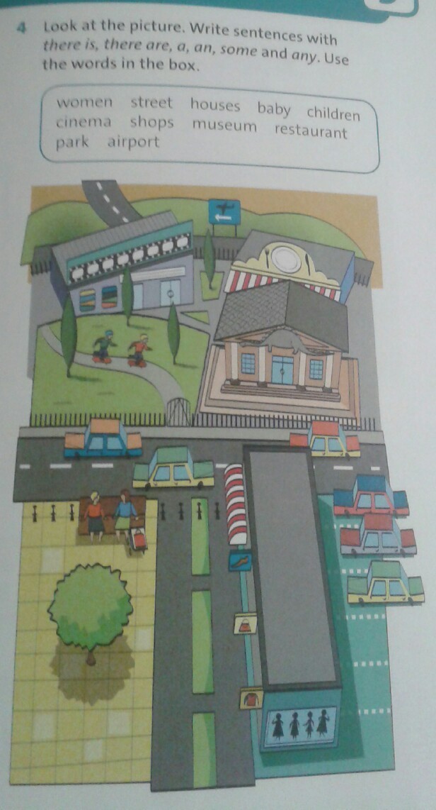 There're two women with a baby in a park that are sitting. Near them there is a shop where you can be some things. Near it there is a museum and behind it you can see a restaurant. You can see some children riding near a cinema ,but there aren't any horses. A street is busy be cars. Maybe they are going to an airport.