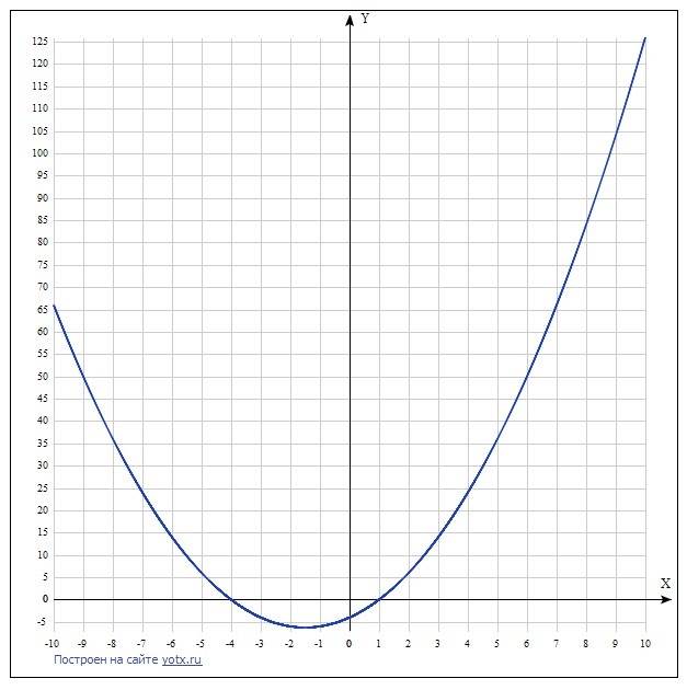 Рисуем параболу, ветви которой направленны вверх, так как у нас х в квадрате со знаком плюс. Точки пересечения на оси Х будут -4 и 1. Закрашиваем всю область, которая меньше нуля (я перенёс ранее уравнение на правую сторону от знака больше, поэтому у нас теперь знак меньше).