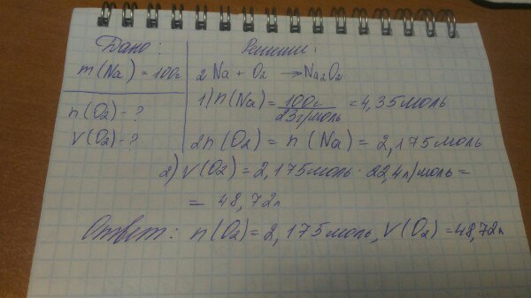 Вычислите обьем и количество вещества кислорода,необходимого для сжигания 100 гр Натрия, плиз помогите