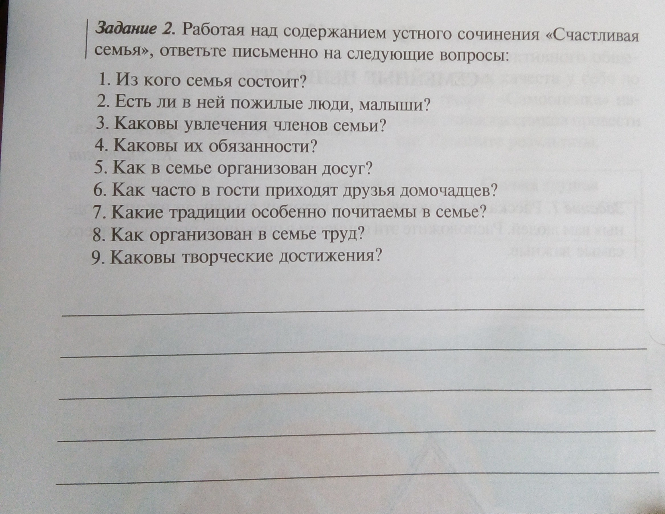 Просто расскажи о своей семье. 2 вопрос например есть ли у тебя в семье пожилые люди или малыши. Напиши просто про свою семью