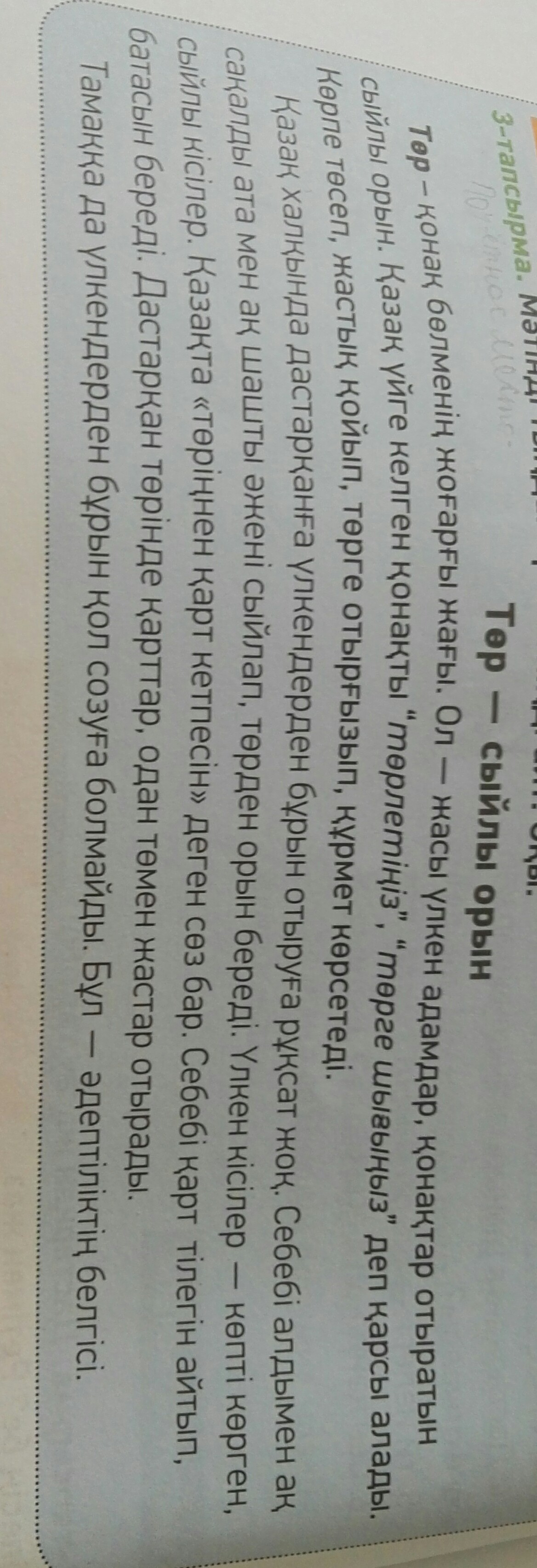 Toр - вершина гостевого дома. Это прекрасное место для пожилых людей, где гости могут наслаждаться. Добро пожаловать казахстанский гость! «Убирайся!» - спрашивает он. Одеяло одевает подушку, надевает подушку, молится и уважает ее. Позорно сидеть у казахского народа до пожилых людей. Прежде всего, белая борода и бабушка будут удостоены бабушки. У больших мужчин много уважаемых мужчин. На казахском языке есть слово «не быть старым». Потому что он говорит старику о его благословении. Есть четыре пожилых человека, младше и старше. Пищу нельзя принимать перед взрослыми. Это признак безнравственности. Конкуренция со взрослыми также считается позором за ужином. Казахский стол открыт для друзей, родственников, родственников и друзей. Казахи идут в дома друг друга и часто любят взаимодействовать. Особенно уважая родителей, приглашая ее к себе домой, рожая ребенка, является обязанностью и обязанностью для казахского ребенка. Ибо стол - начало добра, знак радости.