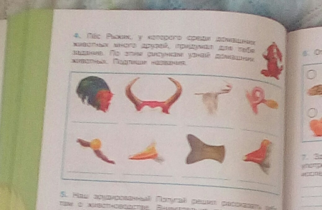 Пёс Рыжик,у которого среди домашних животных много друзей,придумал для тебя задание.По этим рисункам узнай домашних животных. Подпиши названия.