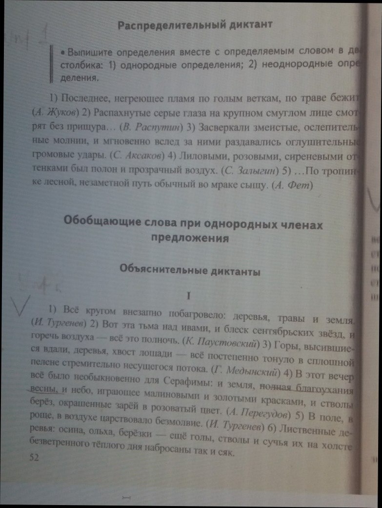 1. Однородные определения: последнее, негреющее пламя; змеистые, ослепительные молнии; лиловыми, розовыми, сиреневыми оттенками; по тропинке лесной, незаметной.