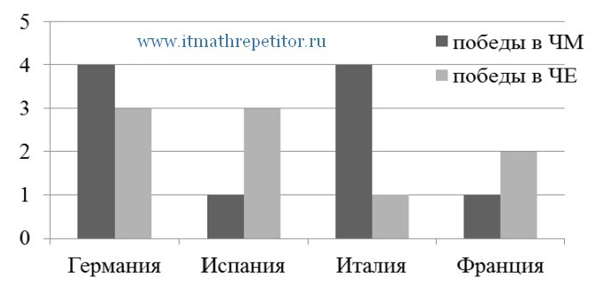 На диаграмме показано сколько побед одержали команды четырех европейских стран в чемпионатах мира (ЧМ) и чемпионатах Европы (ЧЕ) по футболу. Пользуясь этими данными, выполните задания.