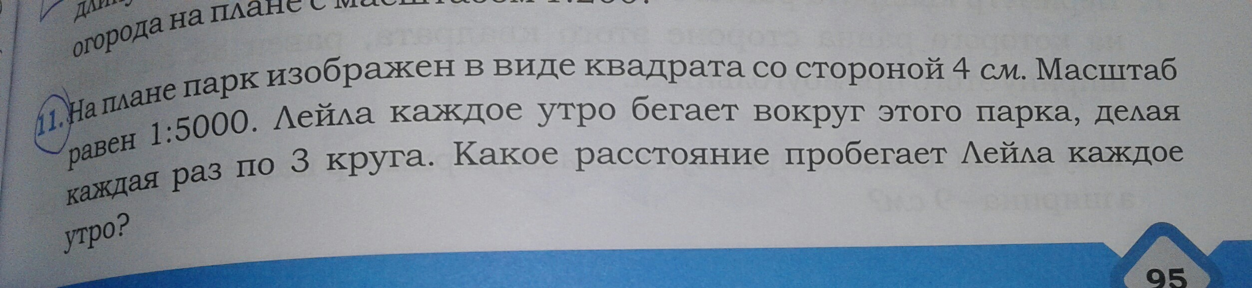 Если в одном сантиметре на плане 5000 см в парке, то есть 1см плана= 50м парка, то 4см = 200м. Периметр квадрата (парка) = 200*4=800м. Следовательно за круг Лейла пробегает 800 м. Каждое утро она пробегает три круга, то есть 3*800= 2400м = 2,4 км