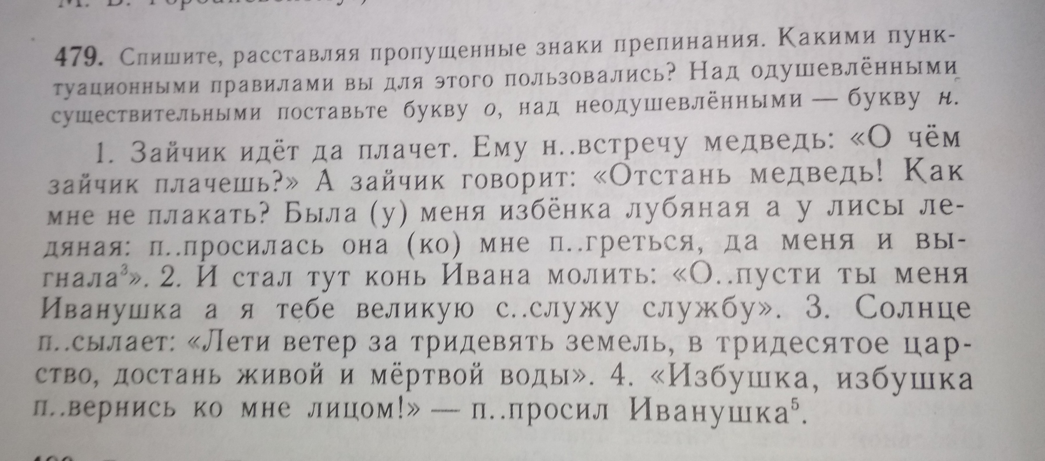 Зайчик(о) идет да плачет. Ему навстречу медведь(о): "О чем, зайчик(о), плачешь?" А зайчик(о) говорит: "Отстань, медведь(о)! Как мне не плакать? Была у меня избёнка(н) лубяная, а у лисы(о) ледяная: попросилась она ко мне погреться, да меня и выгнала". И стал тут конь(о) Ивана(о) стал молить: "Отпусти ты меня Иванушка(о), а я тебе великую сослужу службу(н)". Солнце(н) посылает: "Лети ветер(н) за тридевять земель(н), в тридесятое царство(н), достань живой и мертвой воды(н)". "Избушка(н), избушка(н), повернись ко мне лицом(н)!" - попросил Иванушка(о).