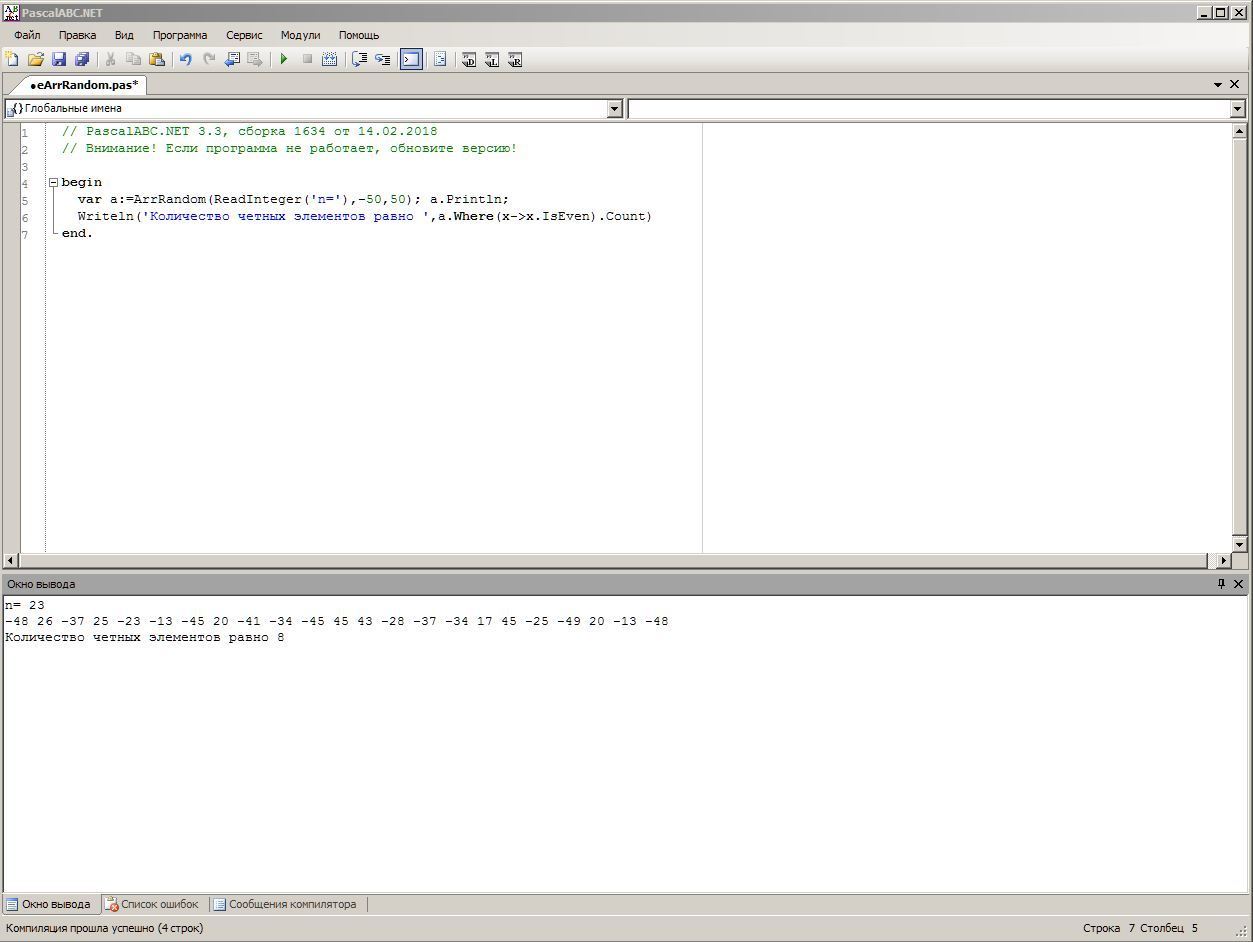 Writeln('Количество четных элементов равно ',a.Where(x->x.IsEven).Count)