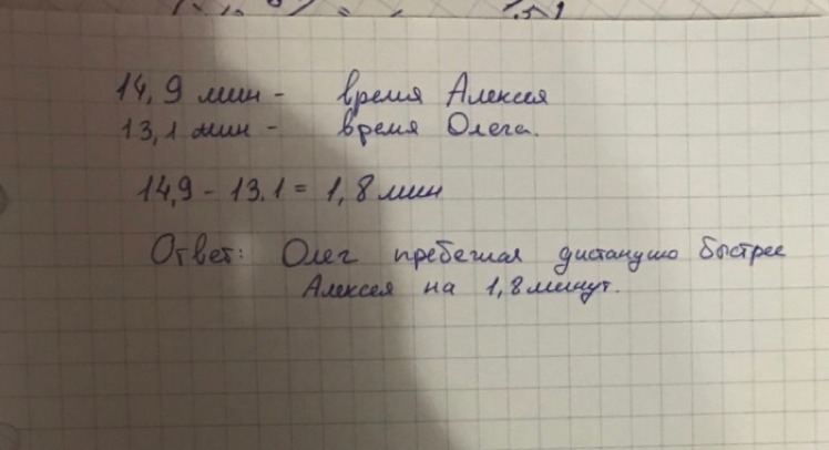 14,9-13,1=1,8(мин) на столько мин. Олег прибежал быстрее чем Алексей