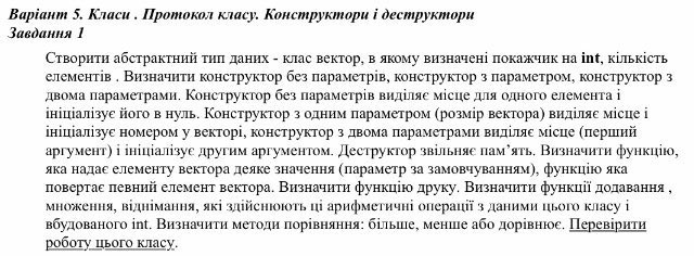 Створити абстрактний тип даних - клас вектор, в якому визначені покажчик на int, кількість елементів . Визначити конструктор без параметрів, конструктор з параметром, конструктор з двома параметрами. Конструктор без параметрів виділяє місце для одного елемента і ініціалізує його в нуль. Конструктор з одним параметром (розмір вектора) виділяє місце і ініціалізує номером у векторі, конструктор з двома параметрами виділяє місце (перший аргумент) і ініціалізує другим аргументом. Деструктор звільняє пам’ять. Визначити функцію, яка надає елементу вектора деяке значення (параметр за замовчуванням), функцію яка повертає певний елемент вектора. Визначити функцію друку. Визначити функції додавання , множення, віднімання, які здійснюють ці арифметичні операції з даними цього класу і вбудованого int. Визначити методи порівняння: більше, менше або дорівнює. Перевірити роботу цього класу.