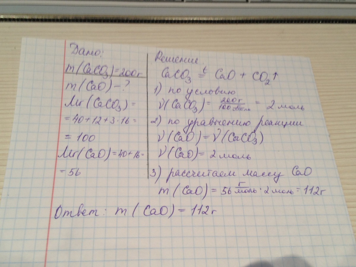 По уравнению реакции CaCO3 = CaO + CO2 рассчитайте массу оксида кальция, который образуется при разложении 200 гр карбоната кальция
