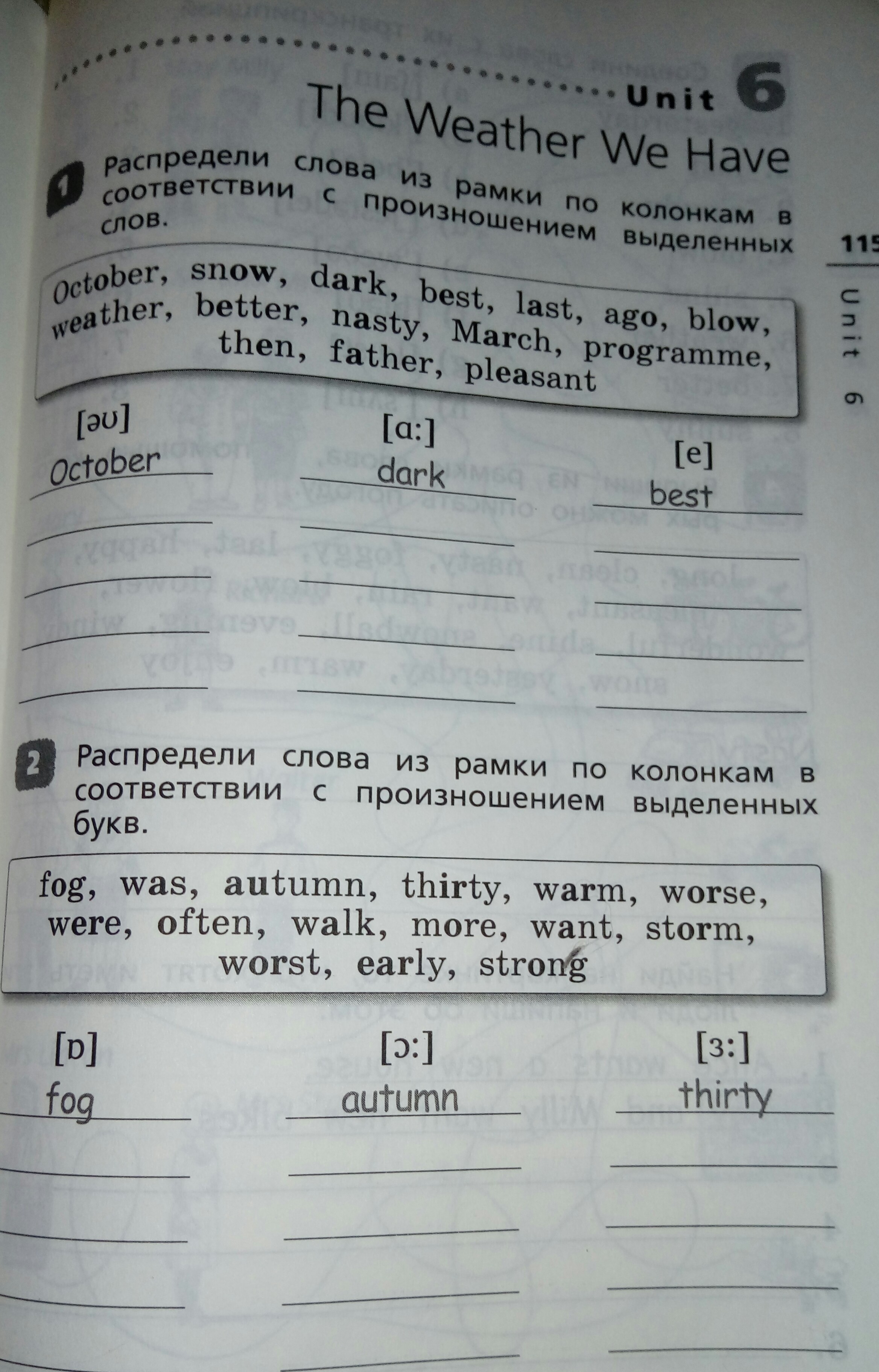 распредели слова из рамки по колонкам в соответствии с произношением выделенных слов