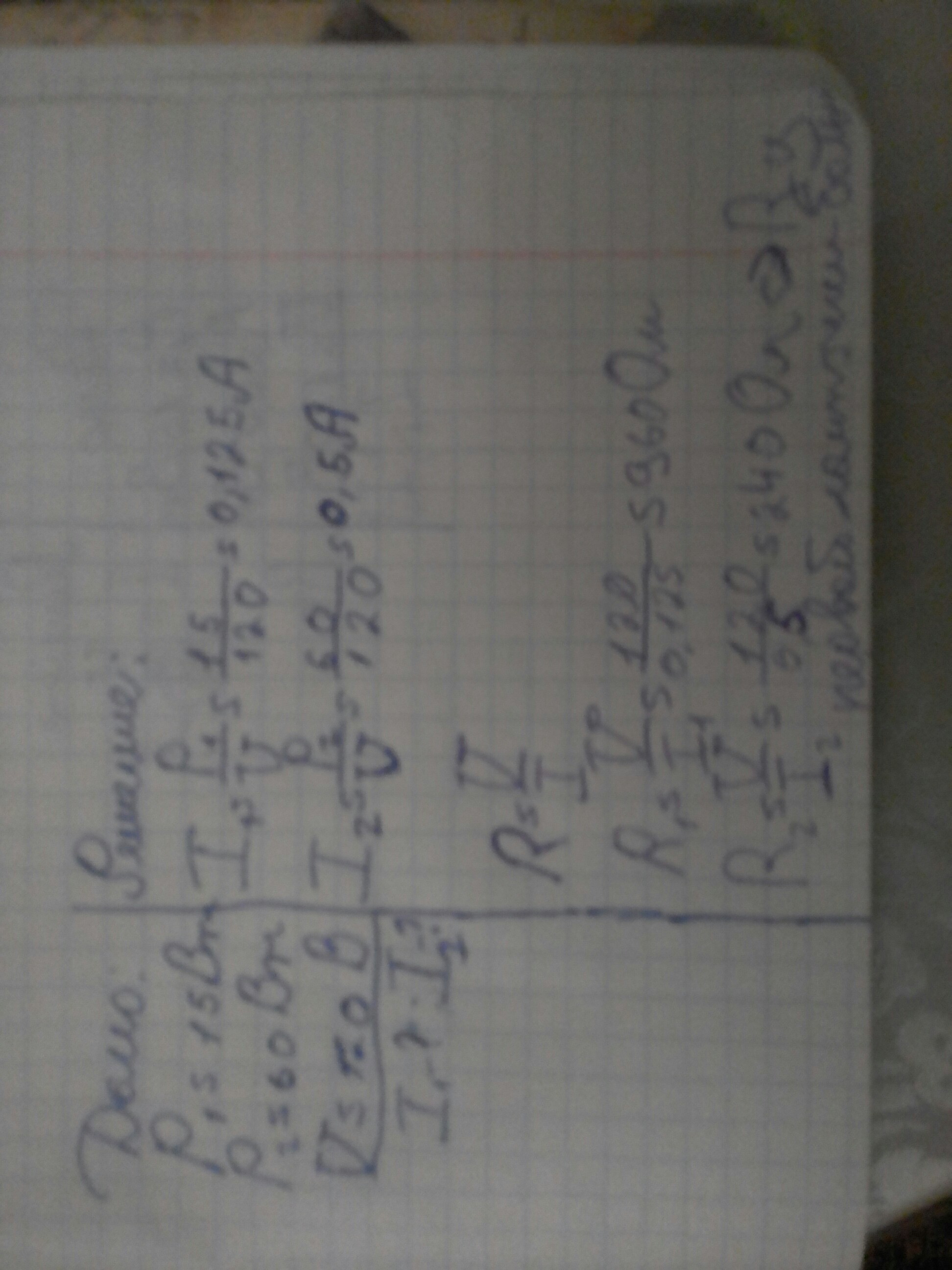 1)две электрические лампы мощностью 15 вт и 60 вт соединены параллельны и включены в сеть, напряжение в которой 120 в.Определите силу тока в каждой лампе.