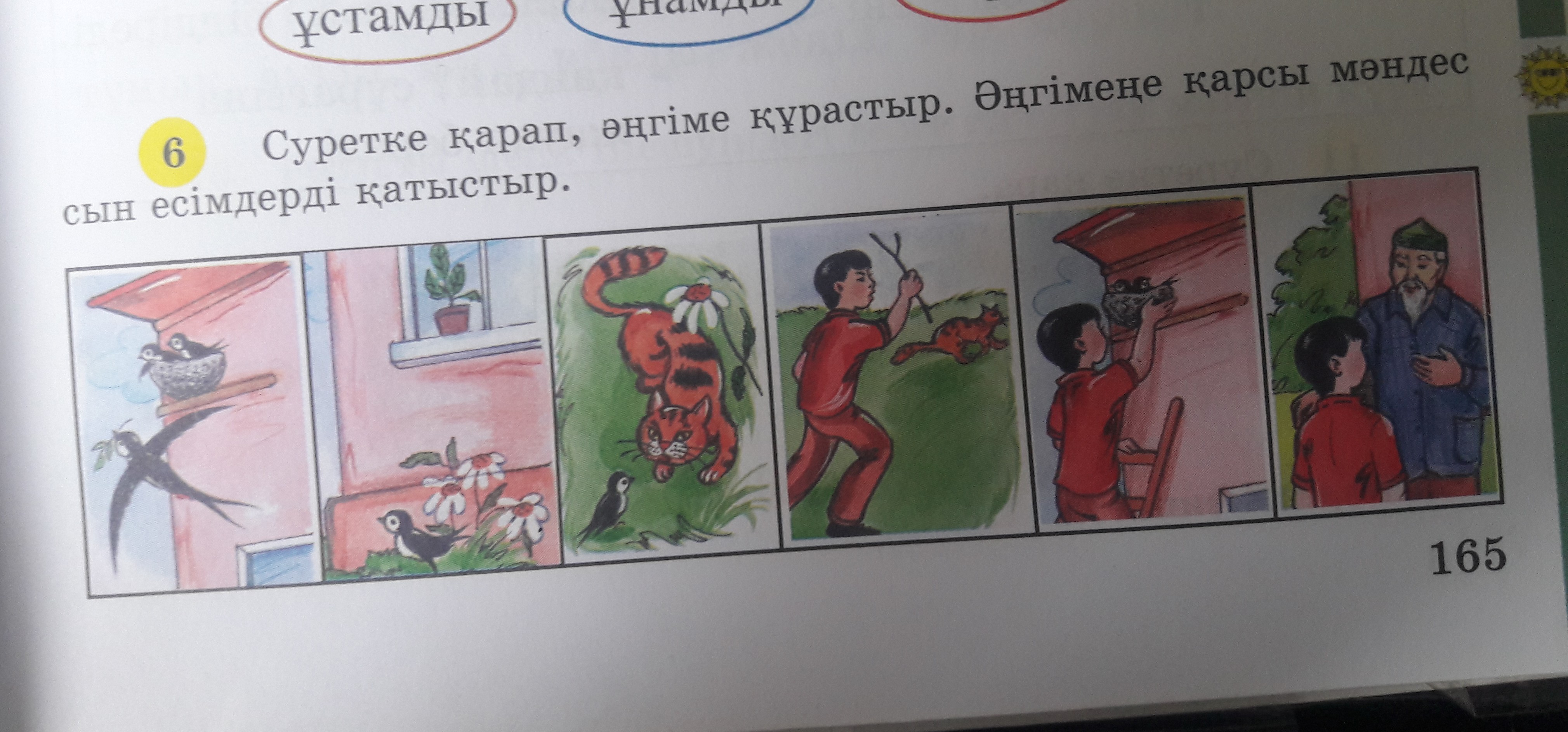 карлыгаш өз баласына жем әкелуге барады. Ол келгенде баланы жерге кулап оны Арыстан жейиндей жатыр, карлыгаш өзи арыстаннан коркканан баска курстардан көмек сурайды . Бирак оган ешким көмек бермейді. Касында бир бала корип калып,арыстанды куып жибереди. Ол балага атасы