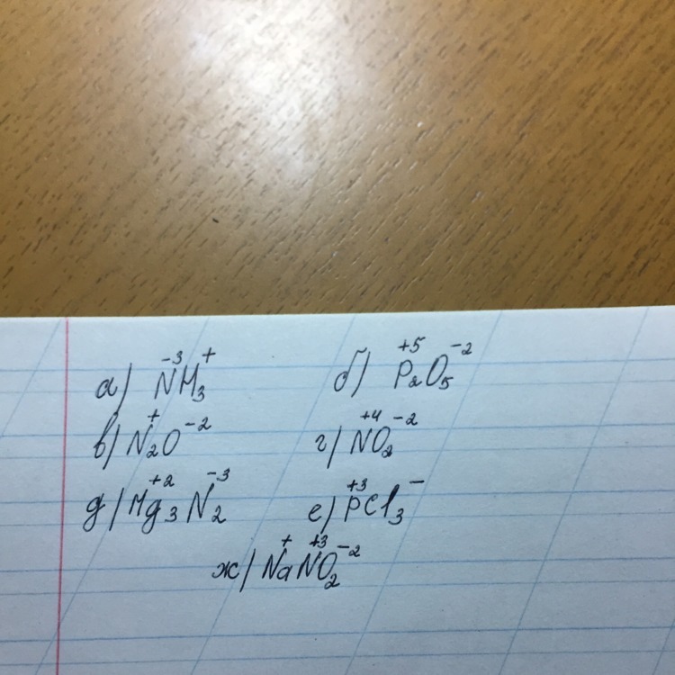 Определите значение степеней окисления азота и фосфора в следующих соединениях: а) NH3; б) P2O5; в) N2O; г) NO2; д) Mg3N2; е) PCl3; ж) NaNO2.