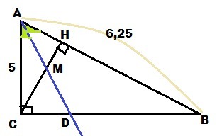В прямоугольном треугольнике ABC с прямым углом C известно,что AB=6,25,AC=5.Найдите ,в каком отношении биссиктриса треугольника AD делит высоту CH.