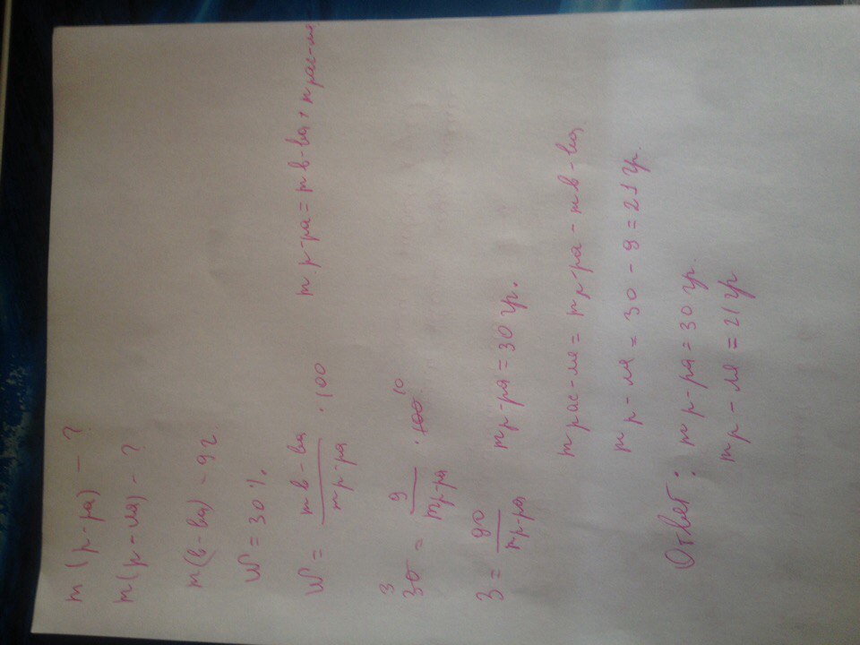 Нужно найти массу раствора и массу растворителя, если известно, что масса растворенного вещества равна 9г, а массовая доля равна 30%