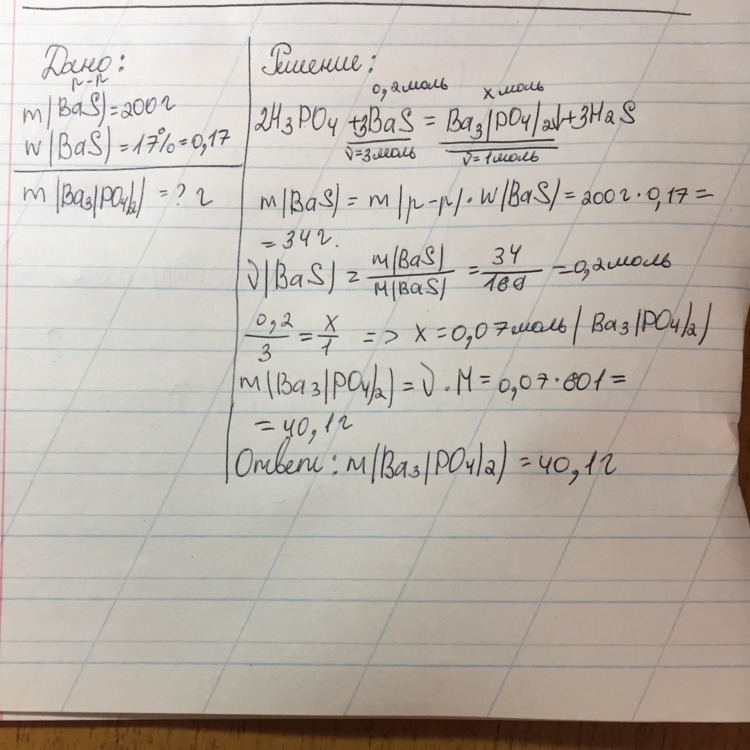 рассчитайте массу осадка, если с фосфорной кислотой прореагировало 200 г 17% раствора сульфида бария
