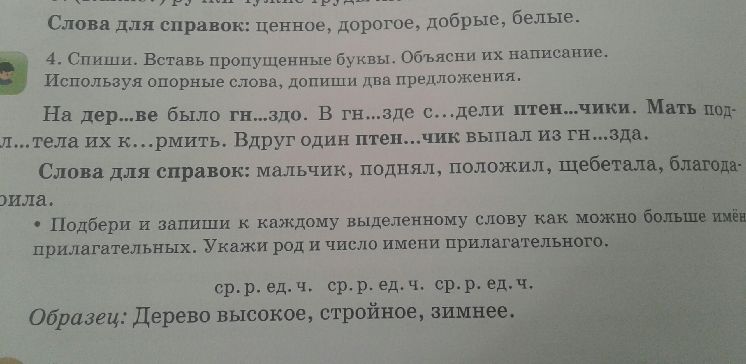 На дереве ( проверочное слово деревья) было гнездо (проверочное слова гнёзда). В гнезде сидели птенчики (нч без ь). Мать подлетела (проверочное слово полёт) их кормить ( проверочное слово корм). Вдруг один птенчик выпал из гнезда. Мальчик поднял маленькое существо и положил обратно в гнездо. Мама защебетала - благодарила за помощь.