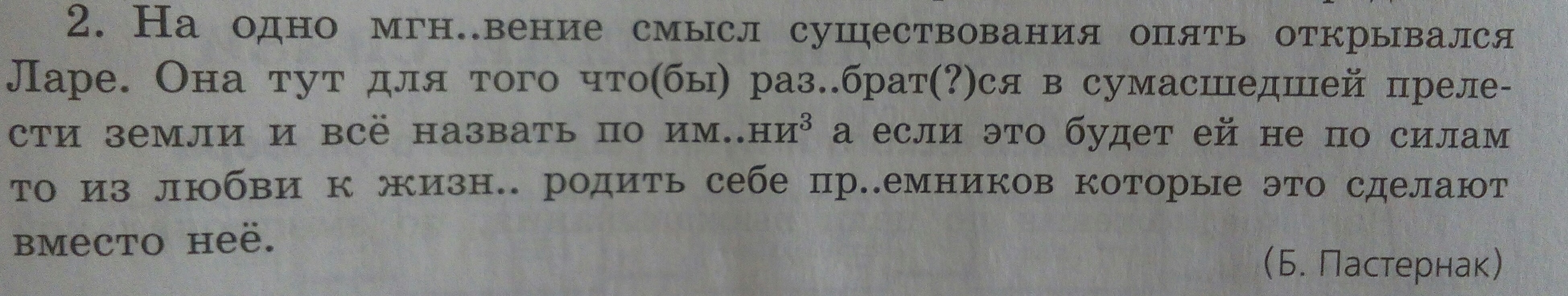 2. На одно мгновение смысл существования опять открылся Ларе.[—=]. Она тут для того, чтобы разобраться в сумасшедшей прелести земли и всё назвать по имени, а если это будет ей не по силам, то, из любви к жизни, родить себе преемников, которые это сделают вместо её.[—, чтобы = и =, а =, то, =, которые =].