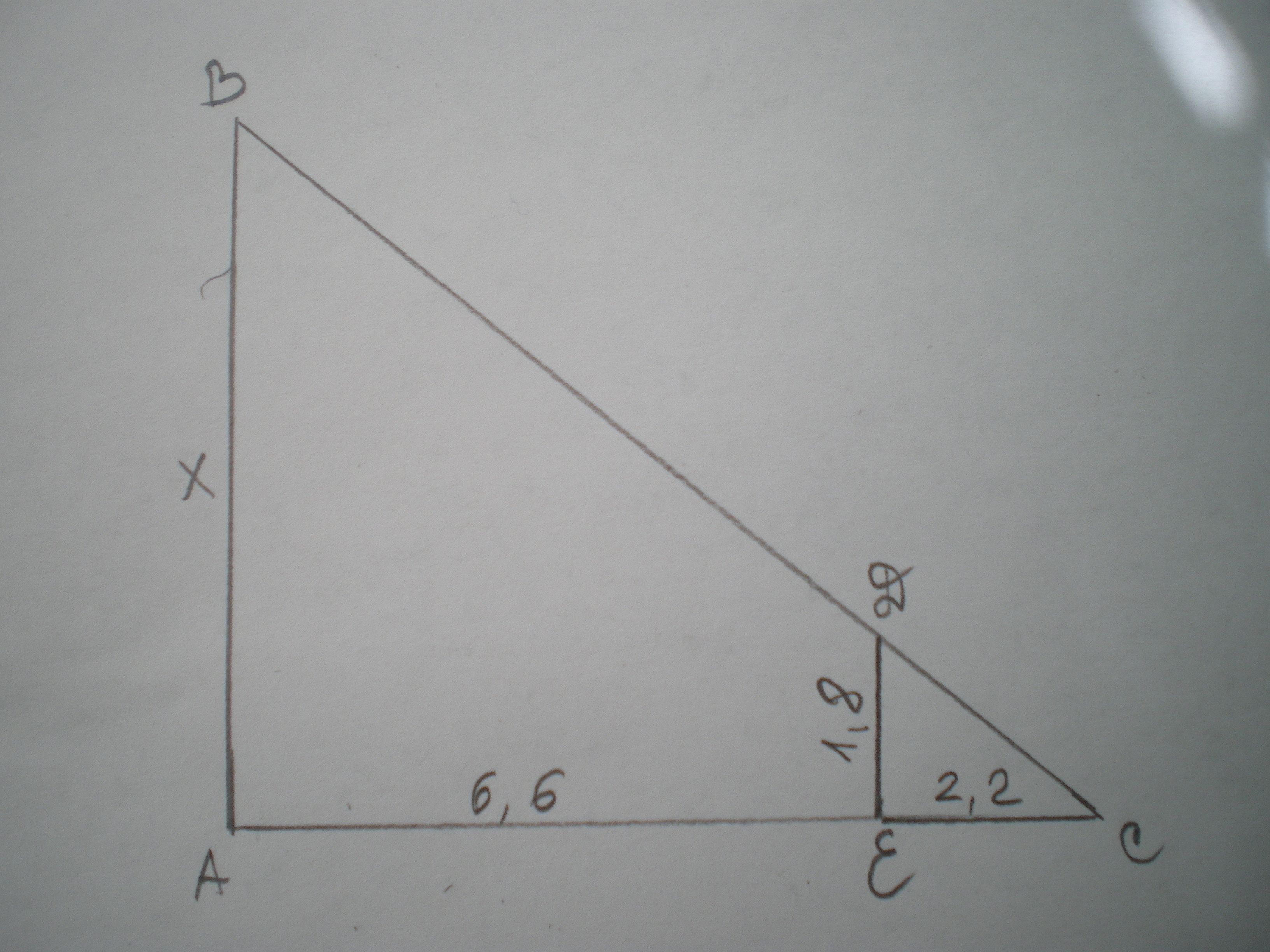 Человек ростом 1,8 м стоит на расстоянии 6,6 м от столба, на котором висит фонарь. Длина тени человека 2,2 м. На какой высоте установлен фонарь? Ответ дайте в метрах.