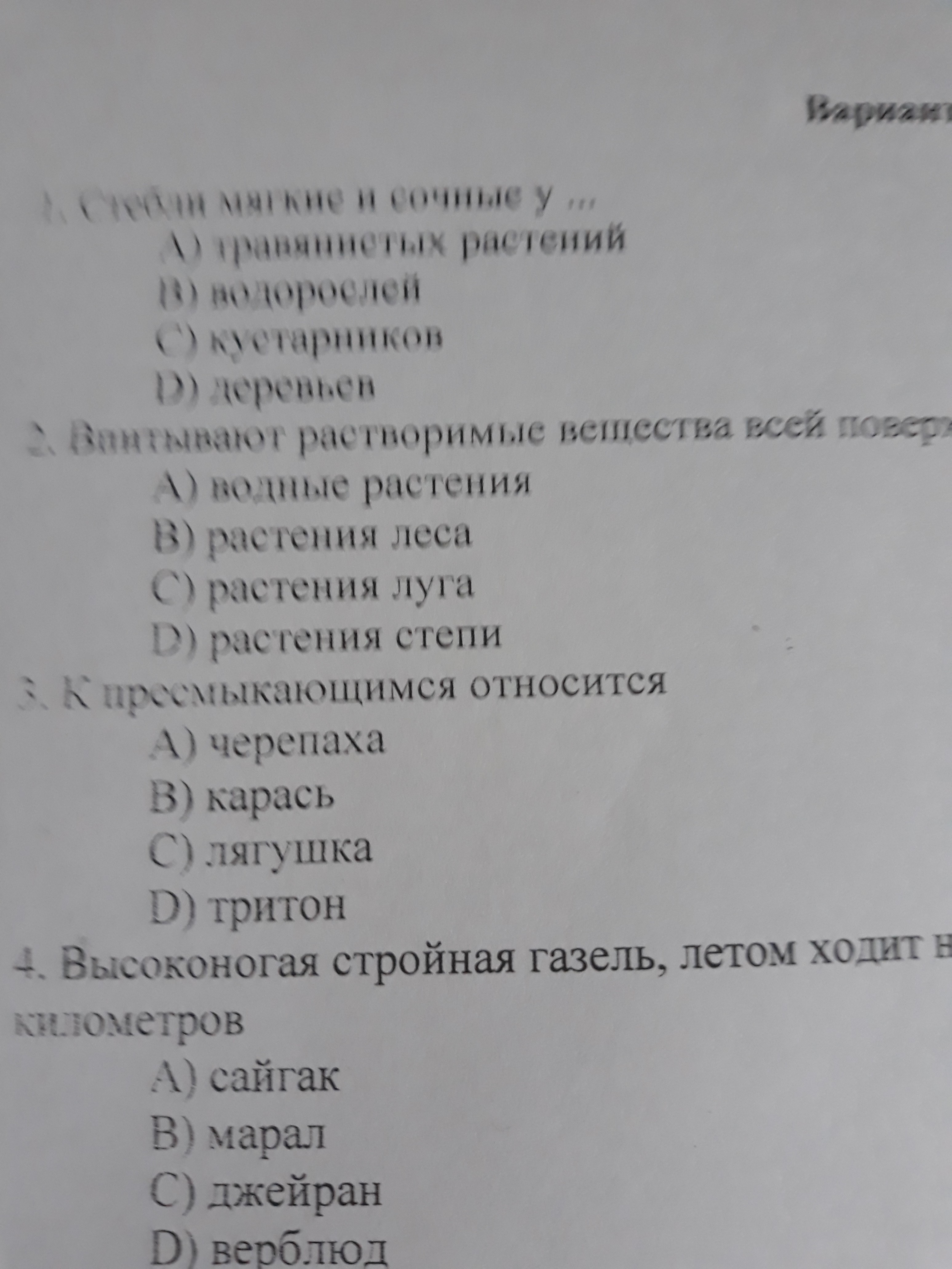 Вариант 6.Стебли мягкие и сочные у А)травянистых растений,В)водорослей С)кустарников