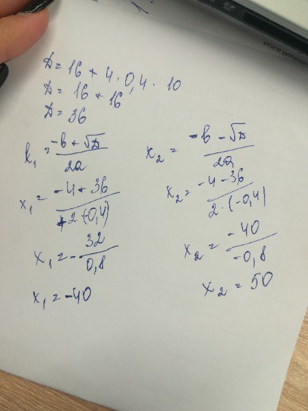 1) D = b2-4ac = 16+4*0,4*10 = 36