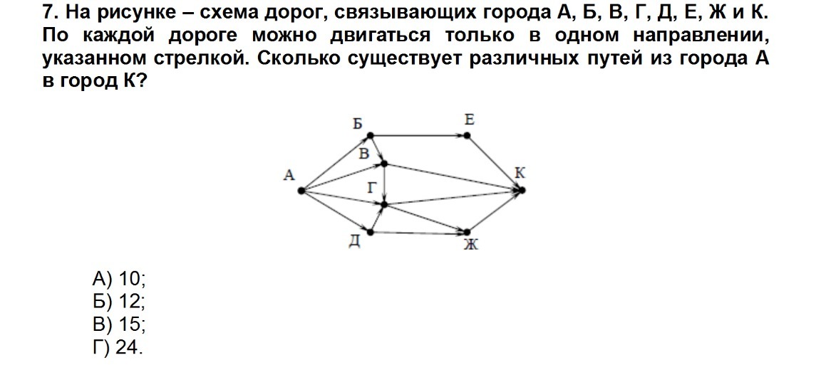 7. На рисунке – схема дорог, связывающих города А, Б, В, Г, Д, Е, Ж и К. По каждой дороге можно двигаться только в одном направлении, указанном стрелкой. Сколько существует различных путей из города А в город К? (рисунок прилагается):