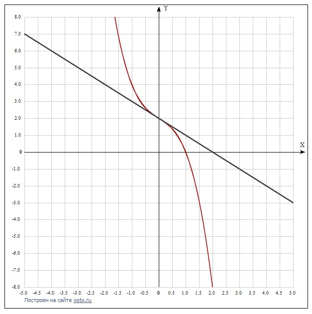 Пишем уравнение касательной у=2+(-1)(х-0) = -х+2. Выполняем чертеж для проверки.