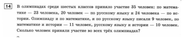 Если мы предположим, хотя в задании это не сказано, что: "Олимпиаду ТОЛЬКО по математике, и по русскому писали 9 человек, по математике и истории - 11 человек, по русскому и истории - 10 человек. Тогда эти же расчеты и ответ 1.