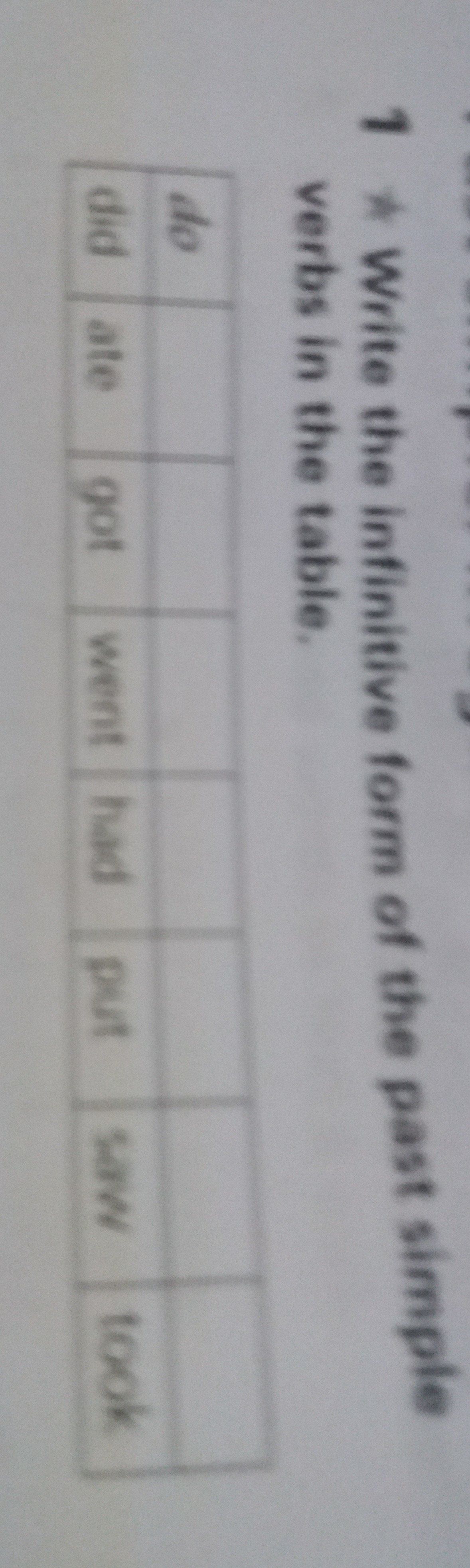 ate-eat, got-get, went-go, had-(has, have), put-put, saw-see, took-take.