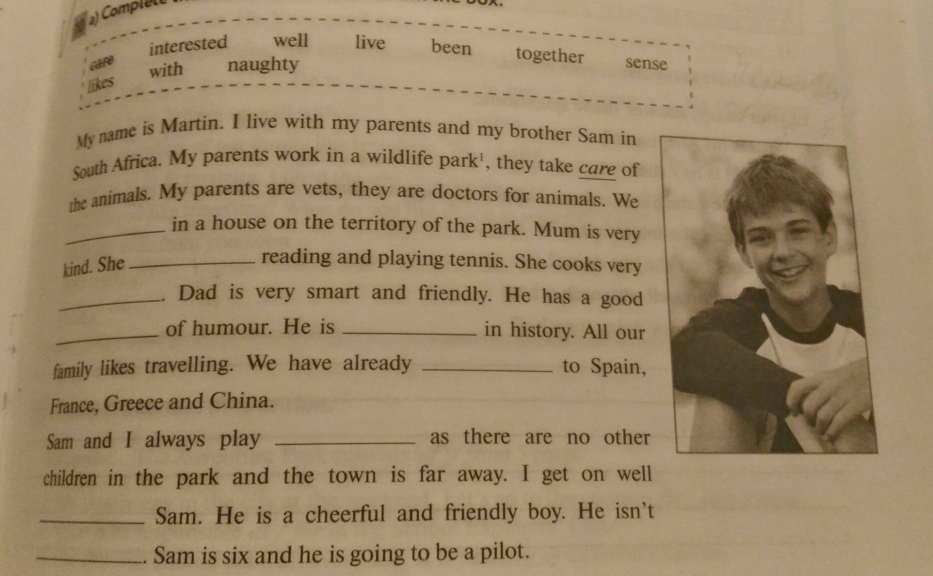 Меня зовут Мартин. Я живу вместе с моими родителями и братом Сэмом в Южной Африке. Мои родители работают в парке для диких животных, за которыми они ухаживают. Мы живем в доме на территории парка. Мама очень добрая. Она любит читать и играть в теннис. Она очнь хорошо готовит. Папа очень умный и дружелюбный. У него хорошее чувство юмора. Ему нравится история. Вся наша семья любит путешествовать. Мы уже были в Испании, Франции, Греции и Китае.