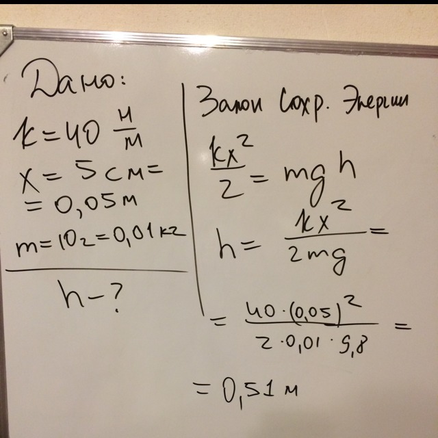 ИЗ ПРУЖИННОГО ПИСТОЛЕТА С ЖЁСТКОСТЬЮ 40 Н/М, СЖАТОЙ НА 5 СМ, ВЫСТРЕЛИЛИ ПУЛЬКОЙ МАССОЙ 10ГРАММ. НА КАКУЮ ВЫСОТУ ПОДНИМЕТСЯ ПУЛЬКА?