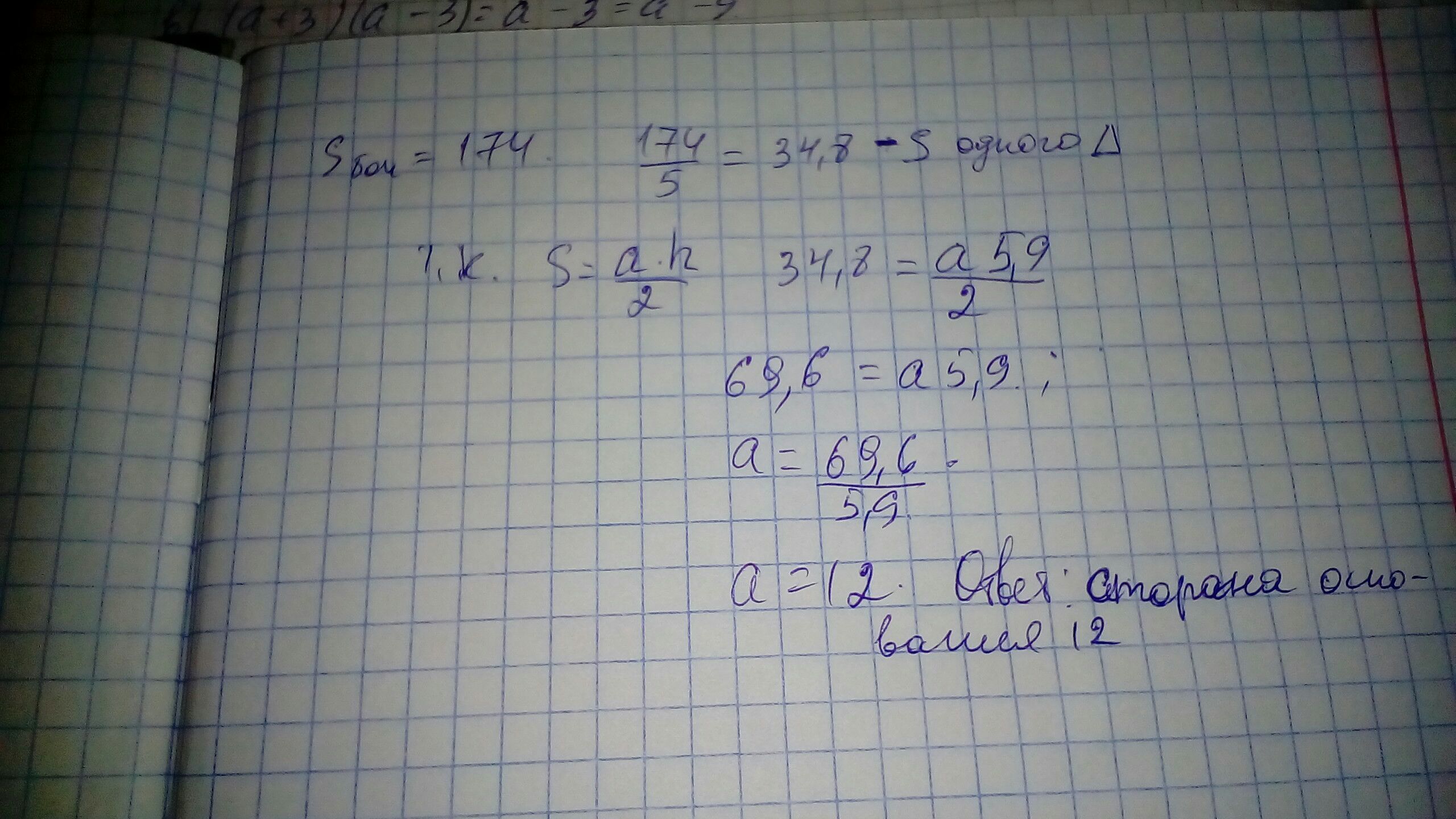 В основании правильной пирамиды лежит пятиугольник. Найдите сторону основания, если площадь боковой поверхности пирамиды равна 174, а апофема пирамиды 5,8.