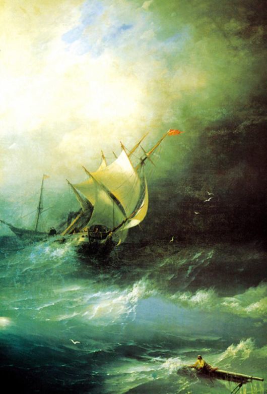 Смотря на эту картину я испытываю страх. Человек,В углу картины держится на плаву за свет обломков корабля,и по всей видимости,свет в левом верхнем углу намекает на то,что он спасется.