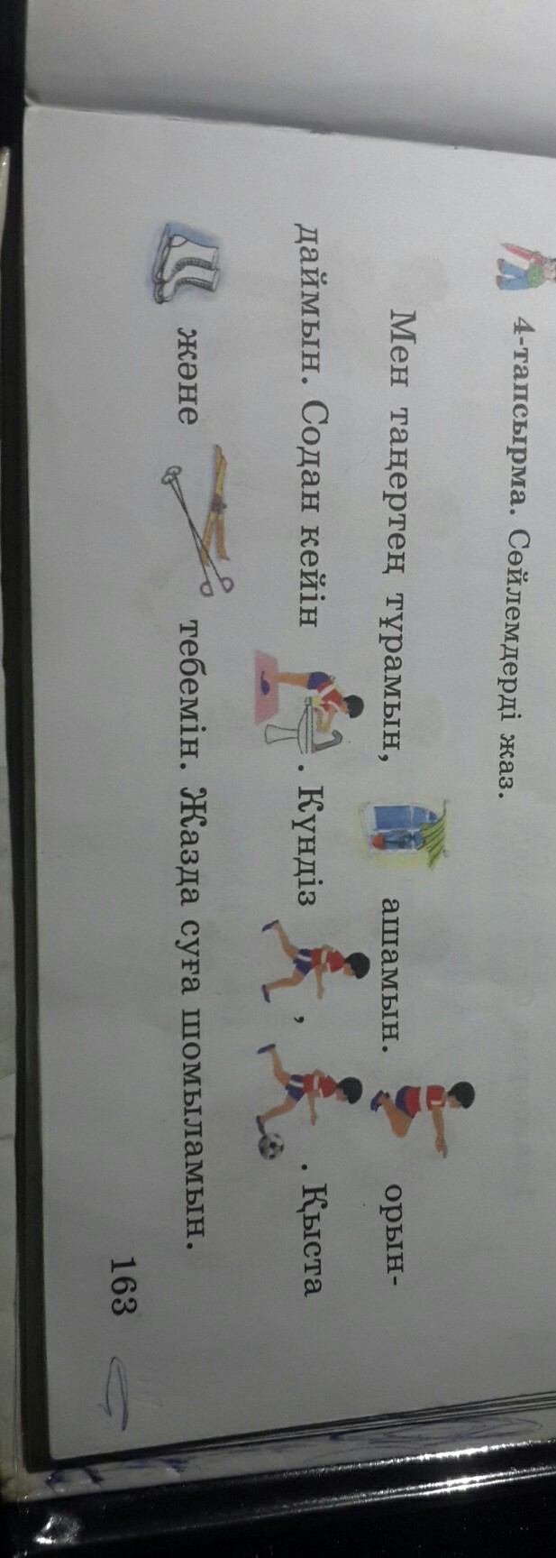 Мен таңертен тұрамын, терезені ашамын. Жаттығу орындаймын. Содан кейін жуынамын. Күндіз жүгіремін, футбол ойнаймын. Қыста коньки және шанғы тебемін. Жазда суға шомыламын.