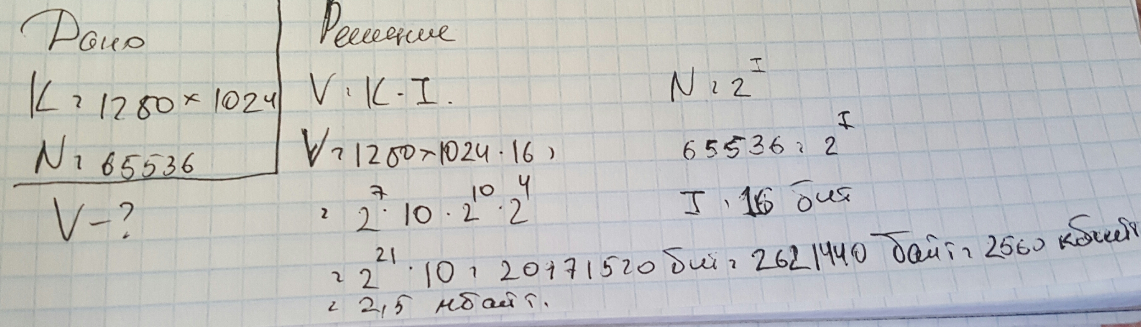 рассчитайте объем видеопамяти необходимой для хранения графического изображения занимающего весь экран монитора с разрешением 1280*1024 и палитрой и 65536 цветов