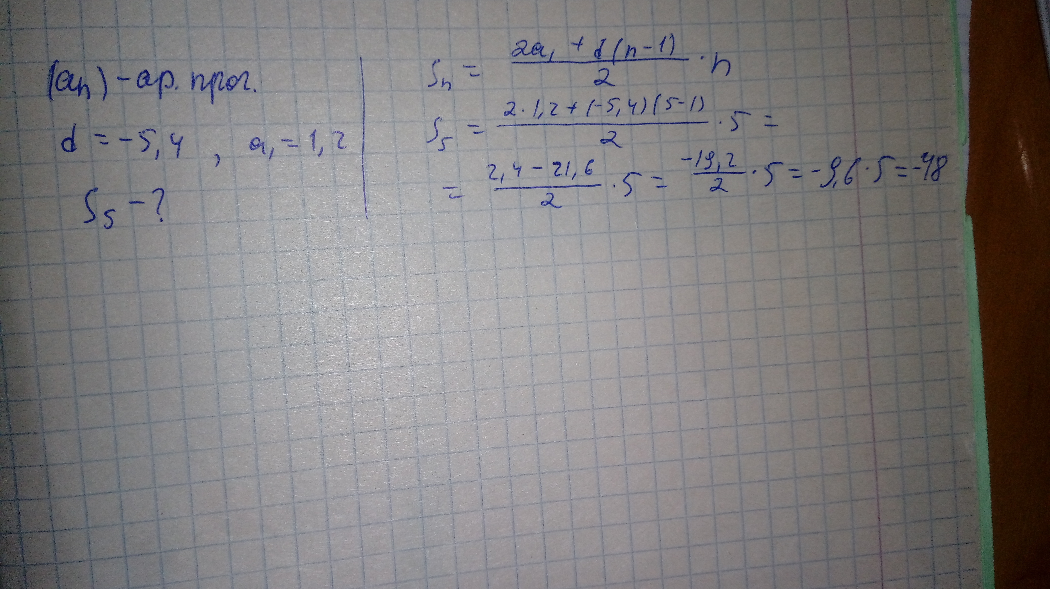 Дана арифметическая прогрессия (a^n),разность которой равна -5,4 , а^1=1,2. Найдите сумму первых 5 её членов. СРОЧН плиз!)