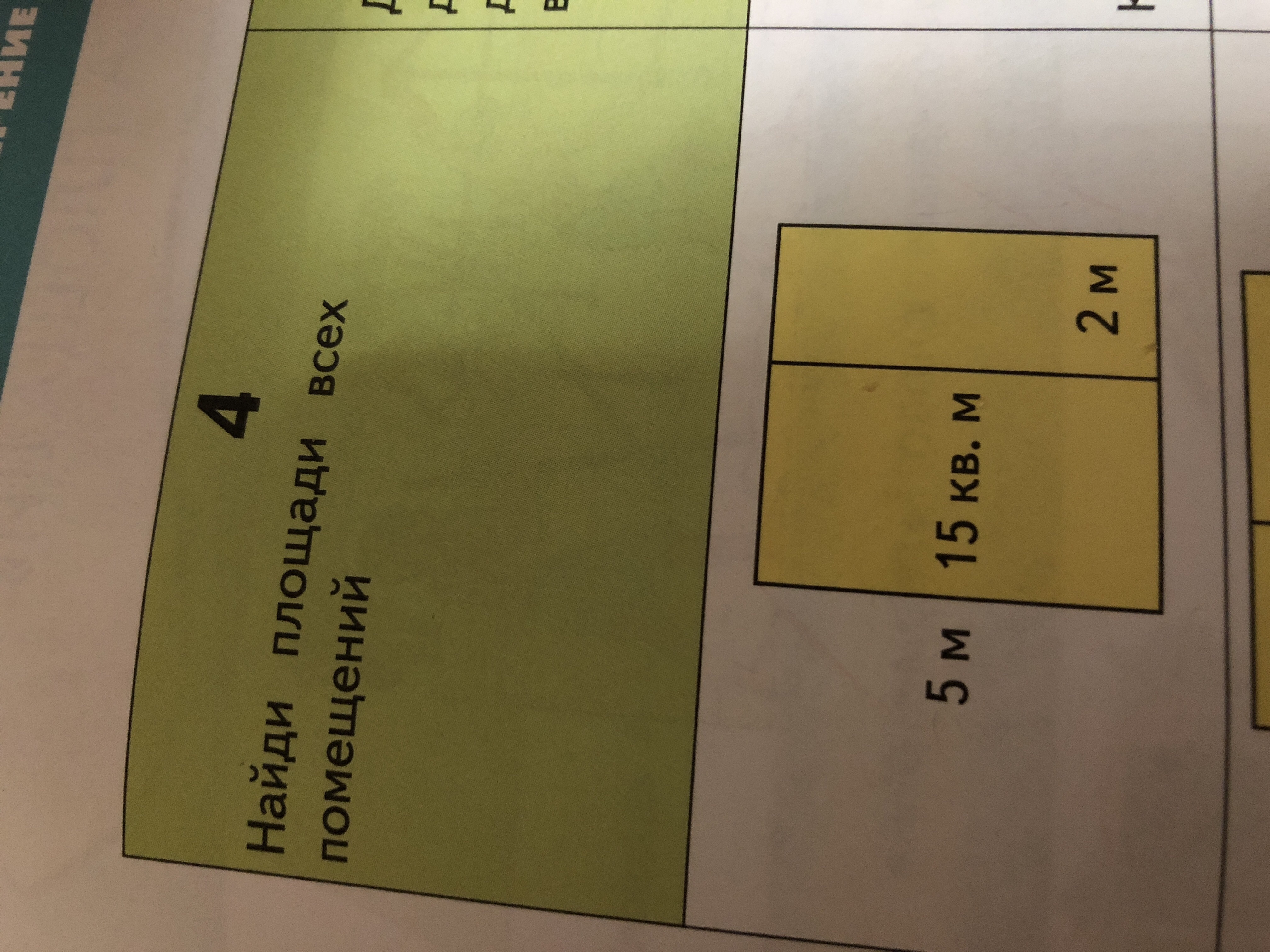 Помогите пожалуйста! Задание найди площади всех помещений. Первая сторона 5 м, первая комната 15 кв.м,во втором комнате длина 2 м. Как решить???