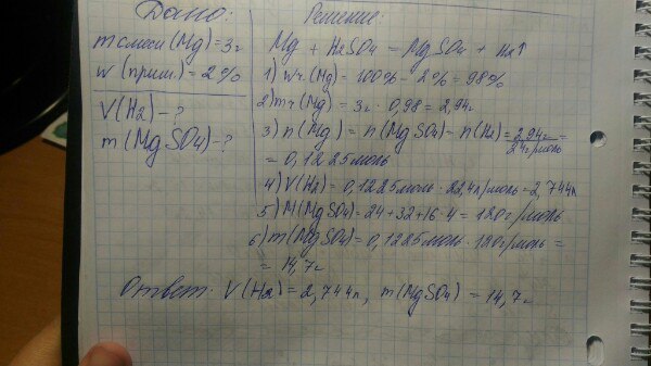 определите массу соли и объем газа образующихся при взаимодействии 3 гр магния и 2% примесей с раствором серной кислоты