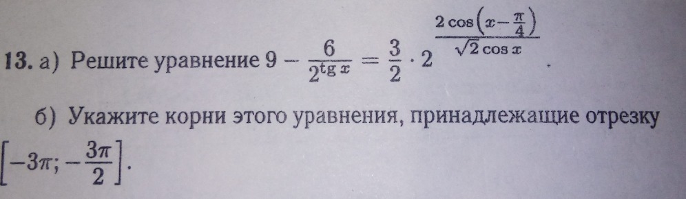 а) решите уравнение 9-6/2^(tgx)=3/2*2^(2cos(x-pi/4)/√2cosx)