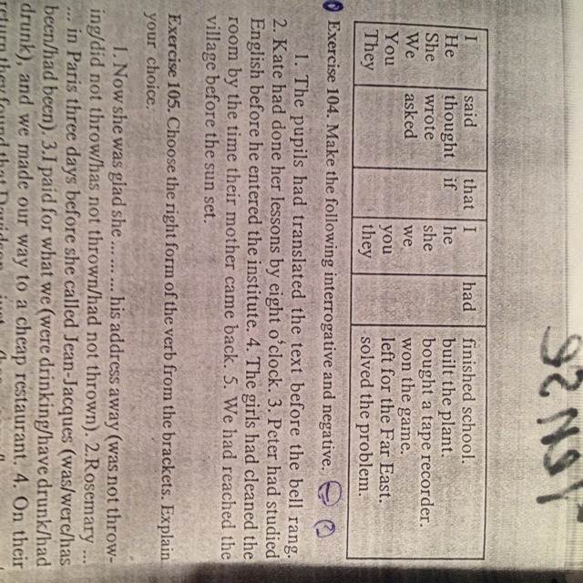 1.Had the pupils translated the text before the bell rang? The pupils hadn't translated the text before the bell rang.2.Had Kate done her lessons by eight o'clock?Kate hadn't done her lessons by eight o'clock.3.Had Peter studied English before he entered the institute?Peter hadn't studied English before he entered the institute.4.Had the girls cleaned the room by the time their mother came back.The girls hadn't cleaned the room by the time their mother came back.5.Had we reached the village before the sun set.We hadn't reached the village before the sun set.