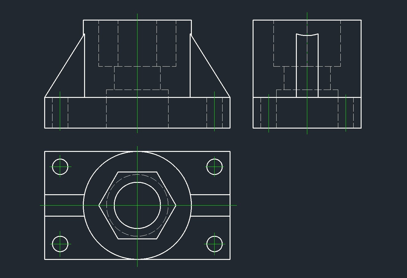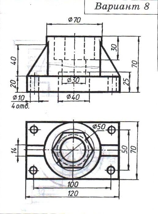 Выполнить комплексный чертеж модели: построить 3-й вид по двум данным, построить фронтальный и профильный разрезы, при крайне важно сти обозначить их, нанести размеры.
