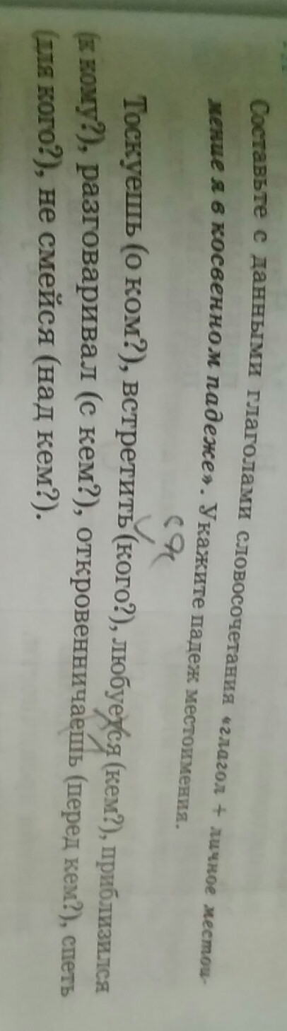 Тоскуешь обо мне(Пр.п.),встретить меня(Р.п.),любуется мной(Тв.п.),приблизился ко мне(Пр.п.),разговаривал со мной(Пр.п.),откровенничаешь передо мной(Пр.п.),спеть для меня(Пр.п.),не смейся надо мной(Пр.п.)